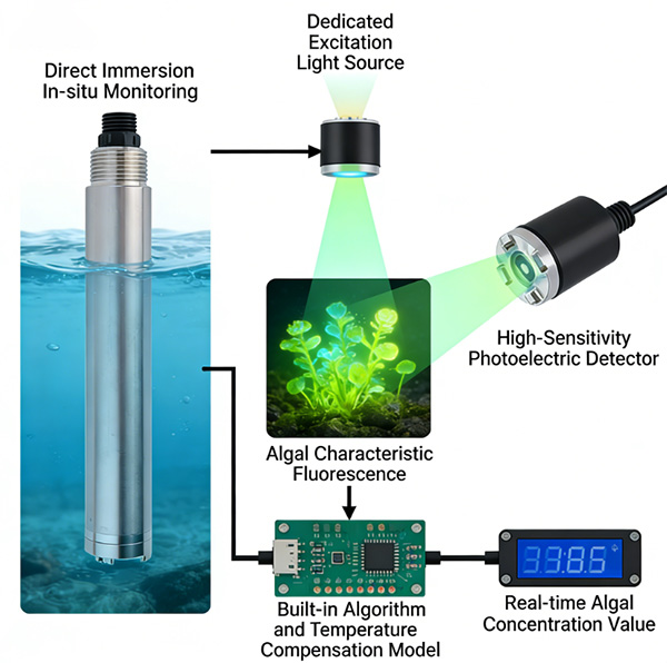 โดยไม่จำเป็นต้องใช้สารเคมีหรือการเตรียมตัวอย่างน้ำล่วงหน้าตลอดกระบวนการ และช่วยให้สามารถตรวจสอบในสถานที่จริงได้โดยตรงด้วยการจุ่มลงในน้ำ อุปกรณ์นี้อาศัยคุณสมบัติการเรืองแสงของไฟโคไซยานินและคลอโรฟิลล์ที่เป็นเอกลักษณ์ของสาหร่ายสีเขียวแกมน้ำเงิน โดยมีแหล่งกำเนิดแสงกระตุ้นเฉพาะและโฟโตดีเทคเตอร์ที่มีความไวสูง หลังจากกระตุ้นเซลล์สาหร่ายให้เกิดการเรืองแสงแล้ว อุปกรณ์จะแปลงสัญญาณการเรืองแสงเป็นค่าความเข้มข้นของสาหร่ายอย่างรวดเร็วผ่านอัลกอริทึมในตัวและแบบจำลองการชดเชยอุณหภูมิ ด้วยการตอบสนองที่รวดเร็วและความแม่นยำในการตรวจจับสูง จึงสะท้อนสถานการณ์สาหร่ายในแหล่งน้ำแบบเรียลไทม์ได้อย่างแท้จริง และแก้ปัญหาความล่าช้าของการตรวจจับแบบดั้งเดิมได้อย่างสมบูรณ์