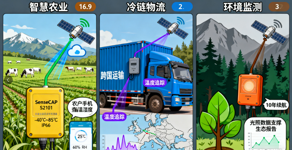 ในด้านเกษตรกรรมอัจฉริยะ การเปลี่ยนแปลงครั้งนี้ได้นำมาซึ่งผลกระทบอันปฏิวัติวงการ ในพื้นที่เพาะปลูกและทุ่งหญ้าอันกว้างใหญ่ไพศาลของยุโรป เซ็นเซอร์วัดอุณหภูมิและความชื้น SenseCAP S2101 สามารถตรวจสอบพารามิเตอร์ด้านสิ่งแวดล้อมได้อย่างแม่นยำในช่วงอุณหภูมิตั้งแต่ -40 ถึง 85 องศาเซลเซียส ด้วยมาตรฐานการป้องกัน IP66 จึงสามารถทนต่อสภาวะที่รุนแรง เช่น ฝนตกหนักและรังสีอัลตราไวโอเลตที่รุนแรง ด้วยการสื่อสารผ่านดาวเทียมที่รองรับโดยเฟรมเวิร์กใหม่นี้ แม้ในทุ่งหญ้าห่างไกลที่ไม่มีเกตเวย์ภาคพื้นดิน เซ็นเซอร์สามารถส่งข้อมูลอุณหภูมิและความชื้นภายในโรงเรือนปศุสัตว์ไปยังคลาวด์ได้แบบเรียลไทม์ ช่วยให้เกษตรกรสามารถควบคุมสภาพแวดล้อมจากระยะไกลได้