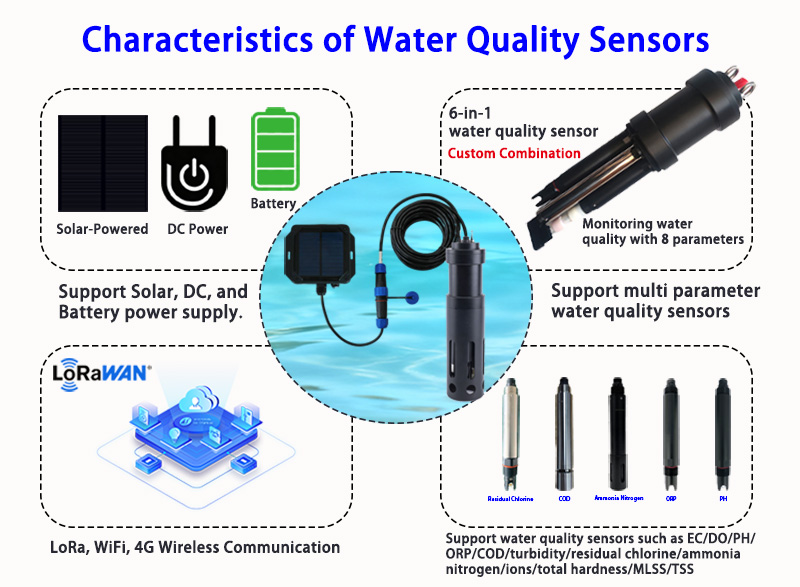 เซ็นเซอร์วัดคุณภาพน้ำพลังงานแสงอาทิตย์แบบหลายพารามิเตอร์ LoRaWAN เป็นเซ็นเซอร์ไร้สายที่ใช้ตรวจสอบคุณภาพน้ำหลายพารามิเตอร์ เซ็นเซอร์วัดค่า COD ของออกซิเจนที่ละลายน้ำ, ค่าการนำไฟฟ้า/ความเค็ม, ค่าความขุ่น, ค่า pH ของแอมโมเนียไนโตรเจน, ORP, ค่าไอออนิก, ความกระด้างของน้ำ, คลอโรฟิลล์, สาหร่ายสีเขียวแกมน้ำเงิน และเซ็นเซอร์วัดคุณภาพน้ำดิจิทัลอื่นๆ เป็นตัวเลือกเสริมสำหรับการตรวจสอบคุณภาพน้ำแบบออนไลน์ในระยะยาว